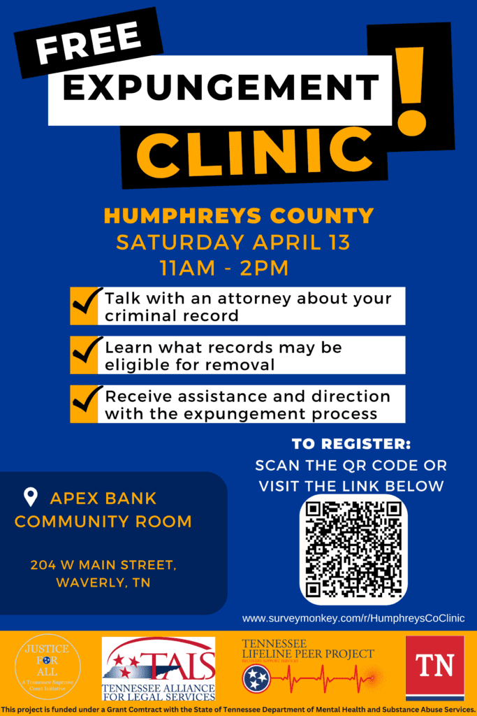 The TN Justice Bus is partnering with the Lifeline Peer Project to host a free expungement clinic in Humphrey’s County.