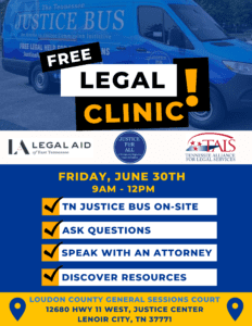 The Tennessee Justice Bus will be on-sight, partnering with Legal Aid East Tennessee on Friday, June 30th for a Free General Civil Legal Advice Clinic for Loudon County.