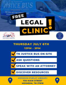 The Justice Bus will be on-sight at the Mosheim Public Library in Moseheim, TN for a General Legal Advice clinic on July 6!