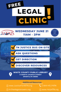 The Tennessee Justice Bus will be on-site on Wednesday, June 21st for a Free General Civil Legal Advice Clinic for White County.