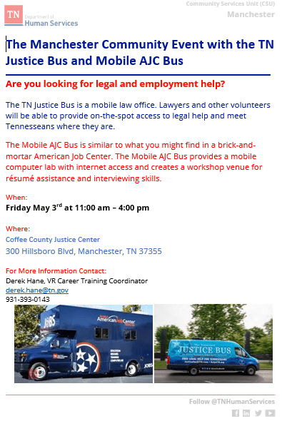 The TN Justice Bus is partnering with the TN Department of Human Services and the Mobile American Job Center Bus for a free legal clinic and community event. Participants will have a chance to work with the American Job Center for resume assistance and interviewing skills. Participants that visit the TN Justice Bus will be able to meet with an attorney, ask legal questions, and receive legal advice and resources.