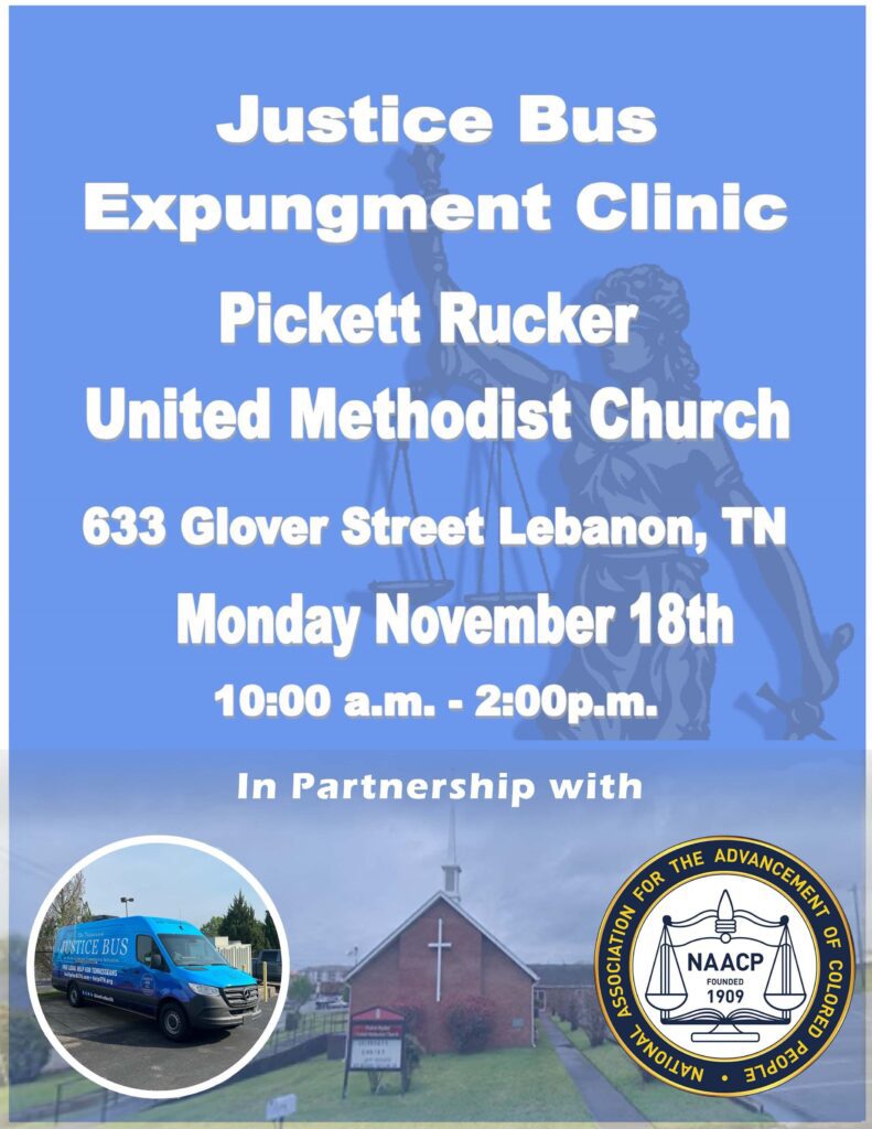 The Tennessee Justice Bus has partnered with the Pickett Rucker United Methodist Church & NAACP to provide an expungement clinic. Participants MUST register in order for the volunteer attorney to access their records and prep their expungement paperwork.