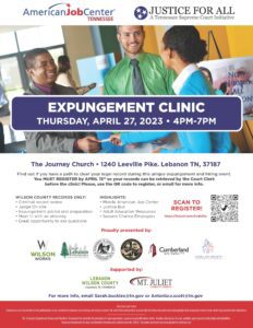 Free Expungement Clinic. The Access to Justice Commission is joining the American Jobs Center, Wilson County Government, Legal Aid Society of Middle TN and the Cumberlands, and many other local partners to help support an expungement clinic in Lebanon, TN where individuals can receive assistance and information on expungements, adult education resources, second chance employers, and an opportunity to ask questions.